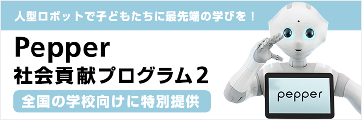 AI(人工知能)、スマートロボット、IoTが普及する時代に生きる子どもたちの論理的思考力や問題解決力、創造力などの育成に貢献することを目的に行っている「Pepper 社会貢献プログラム」。ソフトバンクグループ株式会社が一部費用負担し特別料金でPepper本体、指導書などをお貸し出ししています。