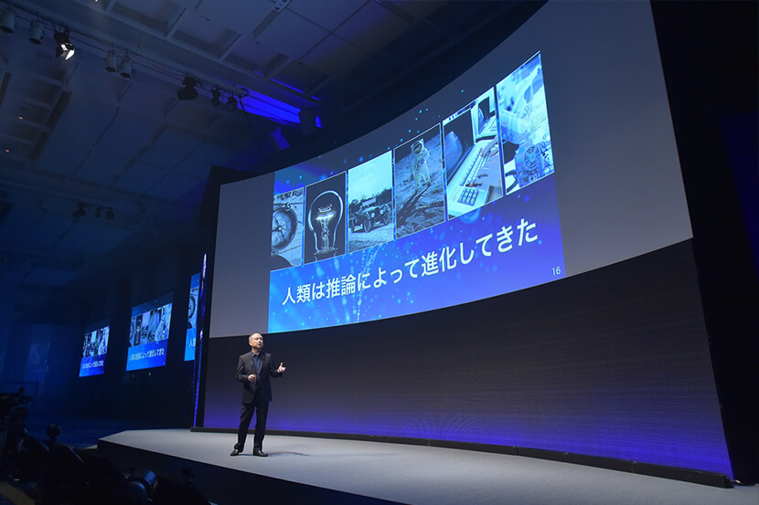 基調講演の冒頭、孫は「空を飛ぶ鳥を見て飛行機の原型が考え出されたように、人間の進化の源泉は推論する力である」と述べ、プレゼンテーションを開始しました。「現時点ではAIよりも人間による推論が正確な分野もあるが、クラウドやIoTの普及によって生み出される膨大なデータの分析にはAIが不可欠となる」と人間の進化が転換期にあることを強調。AIが最も得意とすることはPrediction=予見であり、AIシフトによって推論能力を向上させることが人類進化の鍵になるだろうと訴えました。
