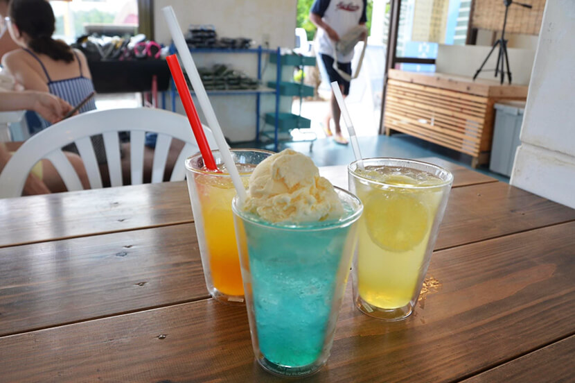 おみやげ購入スポットとしておすすめなのが「島の駅みやこ」。宮古島で作られた加工食品、お菓子、泡盛などなど、おみやげにもってこいの商品に加えて、地元の契約農家さんが卸した新鮮な野菜、くだものなどの特産品も幅広く取り揃えています。初夏から夏にかけては宮古特産の「マンゴー」関連製品も店頭に多く並びます。併設のテラスではお店で買った「宮古島サイダー」を飲む人や、「みやこそば」を美味しそうに味わう人を目にしました。