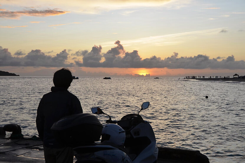 これにて、宮古島一周&3つの大橋の走破ミッション、コンプリート! バイクを降りて、夕日を浴びる海と夕闇の中に霞んで消えていく来間大橋の姿を、しばらく眺め続けていました。充実感と心地よい疲労が体を包みます。「宮古島に来てよかった」と、心から思える最高の時間を味わうことができました。