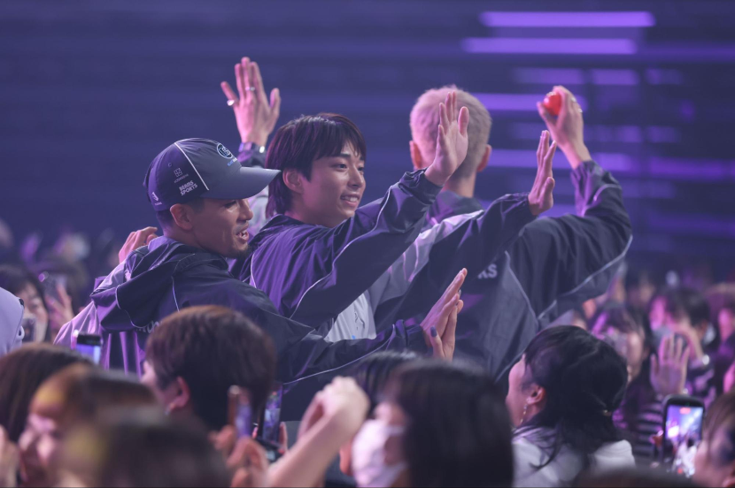開幕を飾る特別企画として、スペシャルコンテンツも行われました! ステージ上だけでなく、Dリーガーたちが観客のすぐそばを歩きながら踊り、手を振ったりサインボールを投げたりと、ファンとの距離がゼロに。客席からは笑顔と歓声があふれ、競技のときの緊張感とは異なるフェスのような楽しい時間になりました。