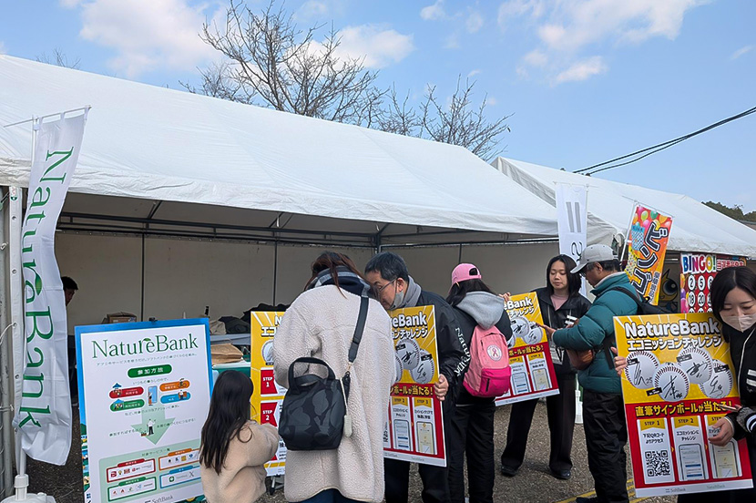 ホークスビレッジのすぐ近くには、ソフトバンクが取り組んでいる森林保全プロジェクト「NatureBank(ネイチャーバンク)」のブースも出展されていました(2月7、8日限定)。ブースでは、エコアクションにつながるミッションをクリアすると、抽選でホークス選手のサイン入りボールなどが当たる企画を実施。多くの来場者でにぎわっていました。