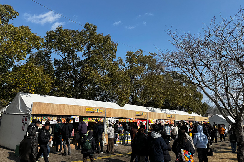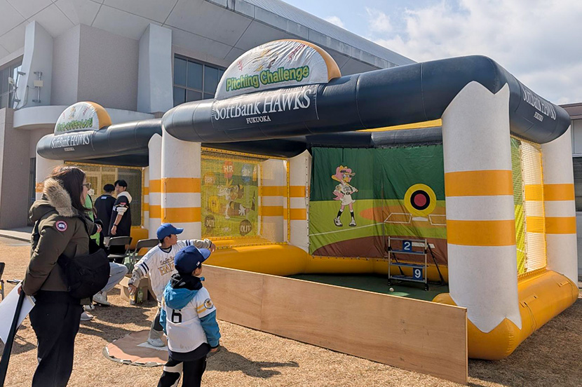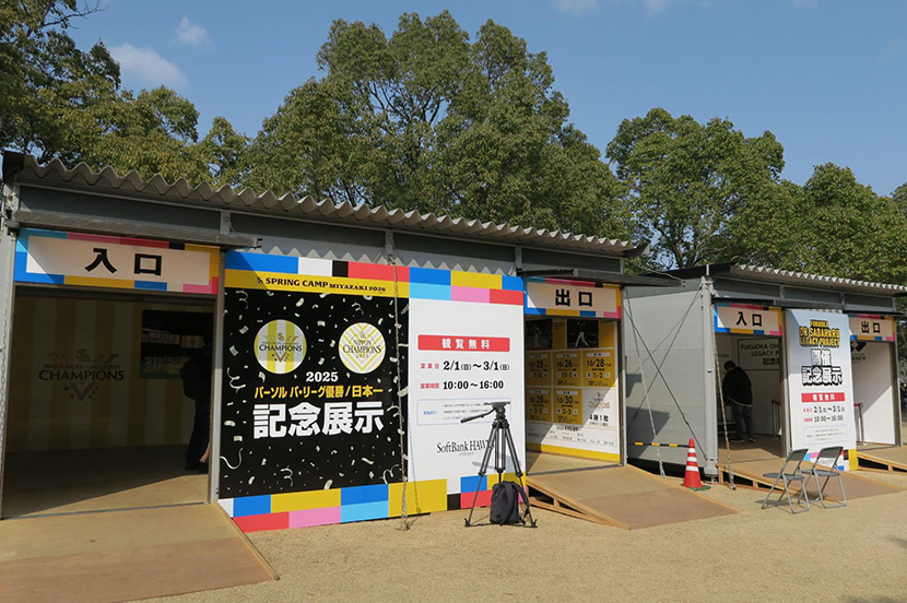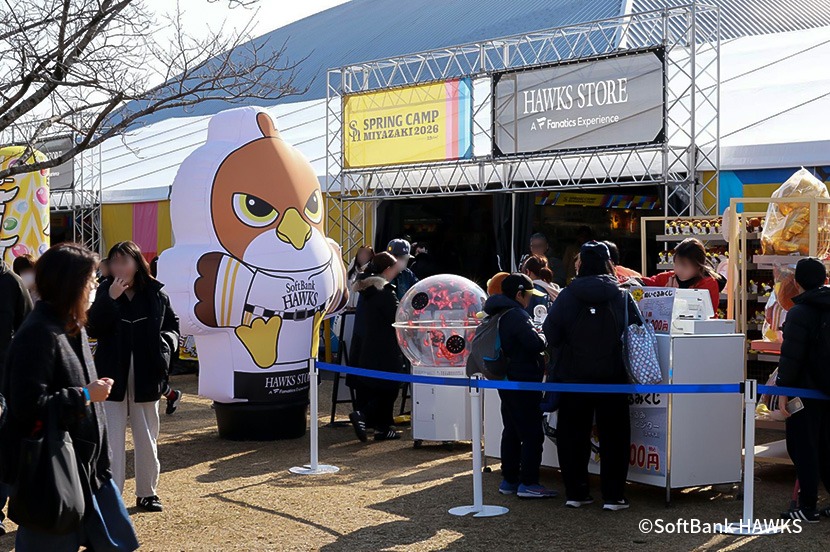 宮崎キャンプでは、選手たちの練習見学はもちろん、ファンが楽しめるさまざまなイベントも行われています。キャンプ地の一角には、グッズ販売コーナーや飲食ブース、イベントスペースが並び、会場全体がにぎわいを見せていました。