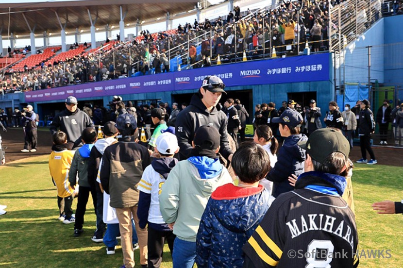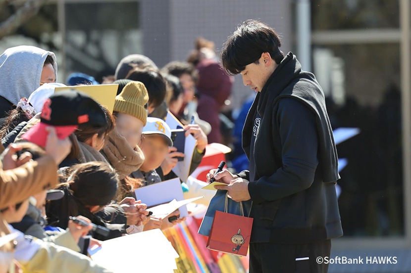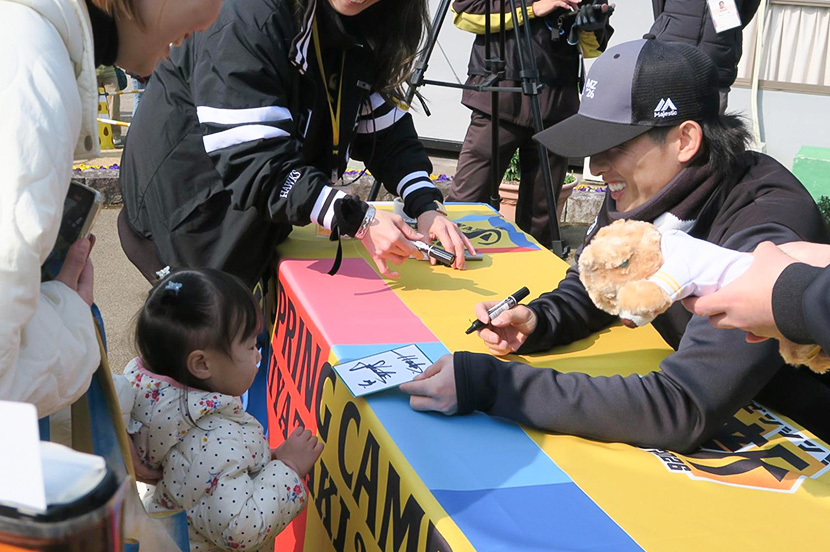 宮崎グルメを堪能していると、前方の広場が何やらガヤガヤとし始めました。サプライズで選手のサイン会が行われるとのこと。どの選手が来るのかをワクワクしながら待っていると、なんと颯爽と登場したのは周東佑京選手! これには、行列を作って待っていたファンの方たちも大喜び。練習の合間にこうした憧れの選手と間近で交流できる機会が設けられているのも、キャンプならではの魅力です。