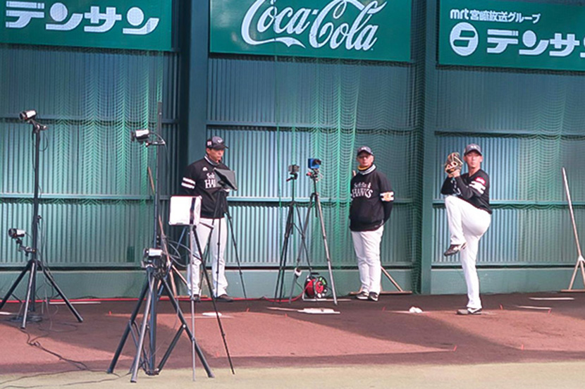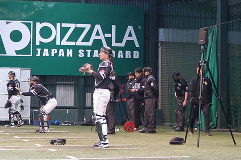 続いて、ピッチャー陣が投球練習をするブルペンに足を運んでみました。到着したときには、ちょうど大津投手が練習をしていたのですが、ここであることに気がつきました。大津投手の周りを取り囲むように、三脚に据えられたビデオカメラや計測機器がいくつも設置され、キャッチャーの後方にもビデオカメラが置かれています。担当者によると、投球のたびにデータが記録されていて、投球フォームやボールの質をチェックしているんだそうです。