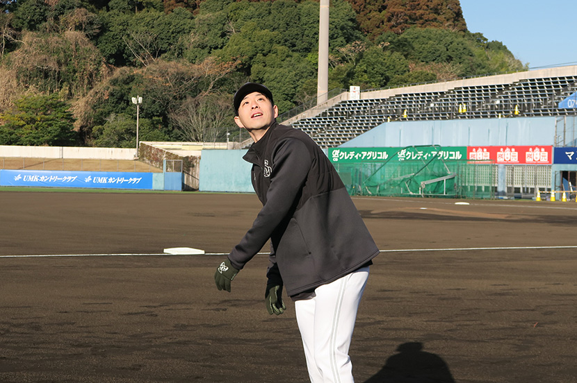 宮崎市生目の杜運動公園メイン球場のアイビースタジアムに到着すると、この日は週末ということもあって、早朝にも関わらず観客席は野球グローブを手にした多くのファンで埋まっています。それもそのはず、例年の恒例行事となっている、選手がサインボールをスタンドへ投げ込む名物イベントが実施されるからです。ベンチから選手が姿を現すと、名前を呼ぶ声が一斉にあがります。