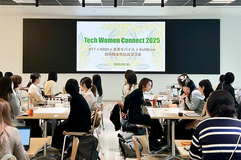 2月5日、KDDI高輪本社にある共創拠点「TSUNAGU BASE」で、NTT株式会社、KDDI株式会社、楽天モバイル株式会社、ソフトバンク株式会社の通信4社による技術職女性社員の合同交流会が開催されました。技術職の女性社員たちが抱える技術職特有の課題を共有・解消し、キャリア形成を後押しすることを目的とした取り組みです。