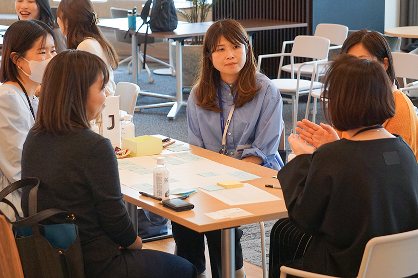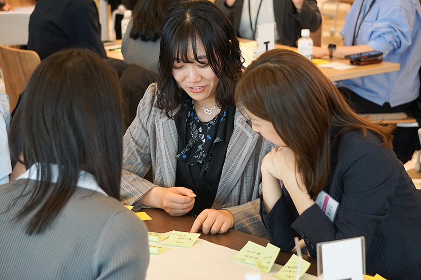 後半のグループワークでは、「パネルディスカッションを聞いて感じたこと」「自身のキャリアの悩み」を付箋に書き出し、グループ内で共有しました。パネル中に取ったメモを見返しながら意見を交わす様子や、互いに共感し合う声が各テーブルから聞こえてきました。最後には「本日の振り返りとネクストアクション」をシートに記入し、全体で共有。参加者からは、ライフステージとキャリアの両立について具体的に議論できたことや、職種特有の課題を共有できたことが学びになったとの声が寄せられ、会社や立場を越えた対話の広がりが感じられる一日となりました。