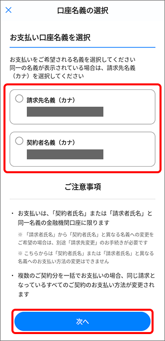 「お支払い口座名義を選択」にて今後お支払いを希望する名義を選択し、「次へ」をタップ