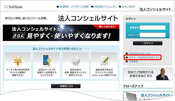 法人コンシェルサイトの「パスワードを忘れた方はこちら」を選択
