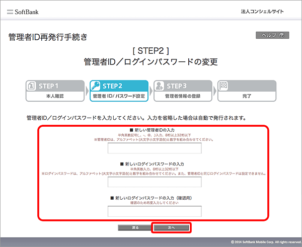 「新しい管理者ID」「新しいログインパスワード」「新しいログインパスワード(確認用)」を入力 → 「次へ」を選択