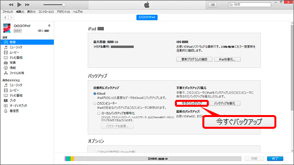 バックアップ時間は、iPad のデータの容量やパソコン環境によって異なります。