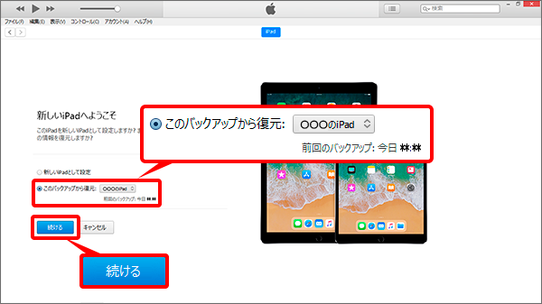 「このバックアップから復元」にチェック → 「続ける」を選択