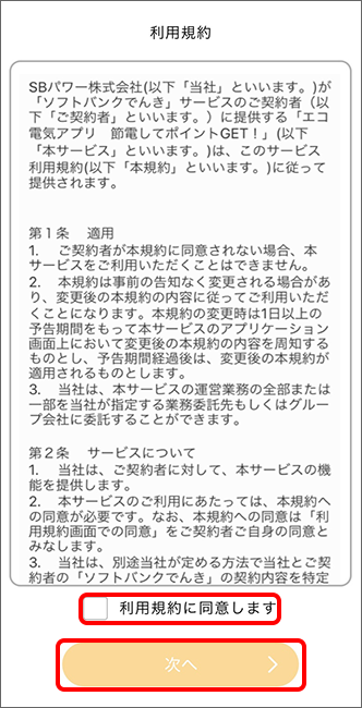 画面の指示に従ってアップデートし、利用規約に同意してください。冬の節電ダブルポイントキャンペーン